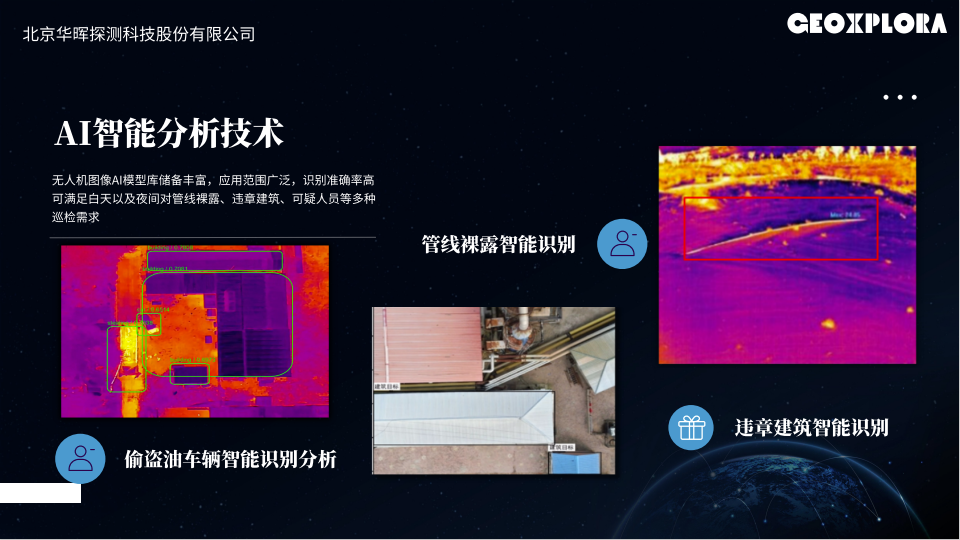 开明兽油气管线泄露智能预警系统”是集物联网、视觉AI、大数据、人工智能等最新科学技术于一体的全天候新型智能巡检管理方式。利用无人机搭载多样负载,可以对油气泄露、夜间盗油、第三方施工等风险点进行自主学习和分类分析,能够及时、准确地监测油气管线的泄露情况,提供实时预警和定位信息,大大降低了泄露事故的风险,保障了油气管道的安全运行。有利于长期管网信息化管理且平均智能识别精度大于95.4%,较人眼识别效率提升4倍。 ● 多信息融合:综合温度、反射率、地物颜色形状、纹理、粗糙度特征,提高漏油判断的准确性。 ● 抗环境干扰:通过多源数据融合,能够降低单一数据源的环境干扰。 ● 自适应性:提供动态阈值参数,根据不同环境条件下的目标特性进行自适应调整。 ● 全流程覆盖:集巡检装备-算法-预警平台-巡检终端一体。